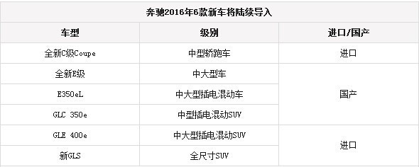 據(jù)了解,全新一代E級將成為奔馳在2016年最重要的產(chǎn)品之一。另外還將包括GLC 350e、E350eL以及GLE 400e在內(nèi)的三款插電混動產(chǎn)品陸續(xù)推向市場,其中前兩者將實現(xiàn)在華投產(chǎn)。與此同時,基于全新C級打造的兩門轎跑車以及新款旗艦全尺寸SUV產(chǎn)品GLS均將陸續(xù)導(dǎo)入國內(nèi)。