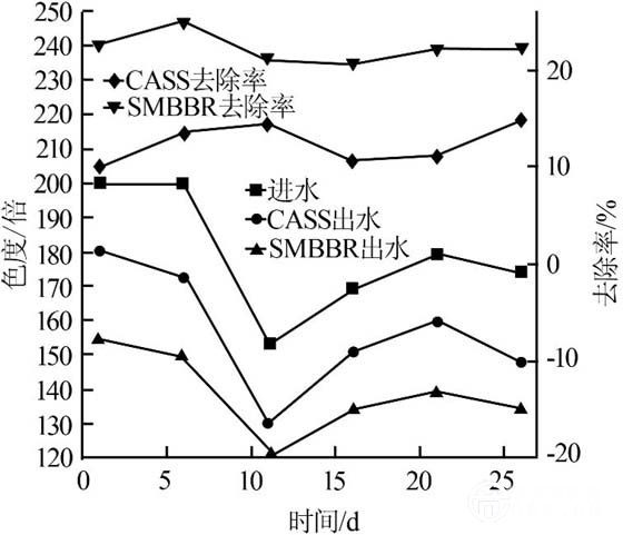 圖5-CASS和SMBBR工藝對(duì)色度的去除效果