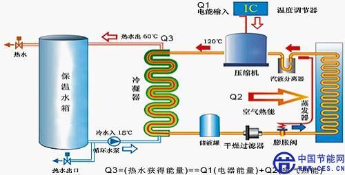 看了上圖,有些用戶可能還是雲(yún)裡霧裡,那麼不妨給大家舉個例子。運用熱泵工作原理制熱,與空調(diào)制冷相反。例如:國家制冷標(biāo)準(zhǔn)是1000瓦,電制冷2800瓦。根據(jù)熱平衡的原理,同時最少產(chǎn)生2800瓦的熱量,加上輸入的1000瓦電,實際產(chǎn)生的熱量在3000-4000瓦,把這些熱量輸送到保溫水箱,其耗電量只是電熱水器的四分之一(電熱水器即使熱效率100%,輸入1000瓦電也隻有1000瓦的熱),參考圖中Q2部分。
