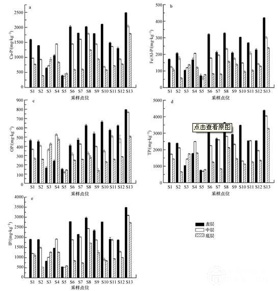 無(wú)機(jī)磷(IP)是湖泊生態(tài)系統(tǒng)中非常重要的磷形態(tài).沉積物中IP平均含量達(dá)到1625.30 mg ˙ kg-1;表層沉積物中IP平均含量最大值和最小值分別出現(xiàn)在S13號(hào)和S5號(hào)采樣點(diǎn)處,分別為3484.57 mg ˙ kg-1和545.37 mg ˙ kg-1,含量降幅最大的出現(xiàn)在S2號(hào)采樣點(diǎn)處,表層TP含量是沉積物底層(10~15 cm)的3.57倍,降幅達(dá)到71.96%.從圖 3d、3e和圖 4中可以得出,沉積物TP、IP含量垂向變化趨勢(shì)基本與CaP一致,而且CaP又在TP、IP中比例均達(dá)到最大,說(shuō)明沉積物中TP含量主要受其中IP含量影響,而IP含量主要受其中CaP含量影響.沉積物中TP含量所表現(xiàn)出的“表層富集”一種普遍存在的現(xiàn)象,一些人認(rèn)為這主要是外源污染嚴(yán)重而導(dǎo)致沉積物表層磷含量的增加: 還有一些人認(rèn)為這可能是由于沉積物中磷的地球生物化學(xué)作用而導(dǎo)致其向表層遷移所致越大.TP含量在垂直距離上表現(xiàn)出逐漸降低的原因可能是河流流速緩慢,低棲動(dòng)物較少,河流中水生植物較少,根系對(duì)沉積物中TP含量影響較小;此外,受到生活污水排放量的增加和農(nóng)業(yè)面源污染加大的影響,大量的外源營(yíng)養(yǎng)物質(zhì)不能夠及時(shí)擴(kuò)散被懸浮物質(zhì)吸附就直接沉淀下來(lái).