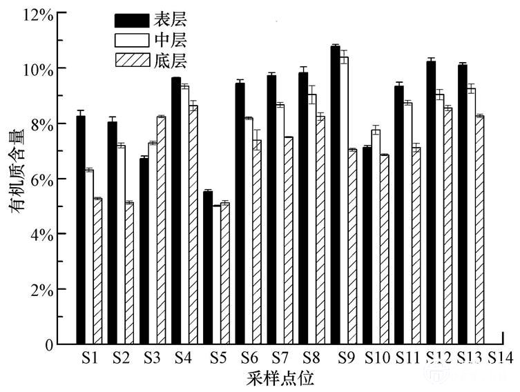 沉積物中有機(jī)質(zhì)是極為重要的膠體之一,是與重金屬及其有機(jī)質(zhì)污染物發(fā)生吸附、分配和絡(luò)合等作用的活性物質(zhì),同時(shí)也是反映沉積物有機(jī)營(yíng)養(yǎng)程度的重要標(biāo)志.掌下浜(北段)各采樣點(diǎn)位沉積物中垂向剖面上有機(jī)質(zhì)含量的變化如圖 5所示.從圖 5可以看出,各采樣點(diǎn)沉積物中有機(jī)質(zhì)的平均含量位于均7.25%~9.46%之間,比對(duì)長(zhǎng)壽湖沉積物有機(jī)質(zhì)含量研究結(jié)果高出3~4倍,與對(duì)南四湖沉積物有機(jī)質(zhì)含量研究結(jié)果相似,與對(duì)太湖西岸湖濱帶沉積物有機(jī)質(zhì)含量研究結(jié)果相似但變化范圍相比較小.在現(xiàn)場(chǎng)采樣時(shí)發(fā)現(xiàn)各采樣點(diǎn)河流均淤積嚴(yán)重,黑臭底泥淤積最嚴(yán)重的可達(dá)1 m以上,沉積物中有機(jī)質(zhì)的重要來(lái)源有可能是河流兩岸的生活污水、農(nóng)業(yè)退水和各種生物殘?bào)w的分解.除S3、S5、S10采樣點(diǎn)外,其余采樣點(diǎn)沉積物中有機(jī)質(zhì)含量均隨沉積深度的增加而降低,其中,降幅最大的出現(xiàn)在S2號(hào)采樣點(diǎn)處,由表層的8.05%降到底層的5.14%;此外,表層有機(jī)質(zhì)含量最大值同樣出現(xiàn)在S9號(hào)采樣點(diǎn)處,表層最小值出現(xiàn)在S3號(hào)采樣點(diǎn)處,有機(jī)質(zhì)含量?jī)H達(dá)6.72%.由表 2可知,沉積物中有機(jī)質(zhì)與各形態(tài)磷的相關(guān)性并不一致.沉積物中有機(jī)質(zhì)在空間分布上與TP與IP含量均具有顯著的相關(guān)性(p<0.01),相關(guān)系數(shù)分別為0.94和0.92,說(shuō)明沉積物中LQI的礦化分解過(guò)程中產(chǎn)生的有機(jī)酸與其他的螯合劑將部分無(wú)機(jī)固定態(tài)磷釋放為可溶態(tài)的磷,有機(jī)質(zhì)中富里酸聚陰離子與磷酸鹽陰離子產(chǎn)生吸附競(jìng)爭(zhēng),通過(guò)專(zhuān)性吸附進(jìn)入礦物離子,由此促進(jìn)沉積物中磷的釋放.此外,沉積物中有機(jī)質(zhì)含量與CaP也顯著相關(guān)(p<0.05,n=13),與OP和Fe/AlP的相關(guān)性不顯著,表明沉積物中TP含量主要來(lái)自于CaP,其次是Fe/AlP和OP.