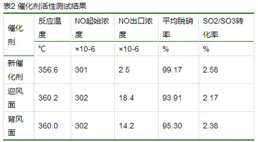 催化劑活性測試結(jié)果見表2??梢钥闯?,一方面,新催化劑的脫硝性能和SO2/SO3轉(zhuǎn)化率明顯高于舊催化劑,說明催化劑投運(yùn)后確實(shí)存在失活現(xiàn)象;另一方面,背風(fēng)面的催化劑活性也高于迎風(fēng)面,這主要可能是由于迎風(fēng)面的催化劑磨損相對(duì)嚴(yán)重,導(dǎo)致活性成分損失較多,而且有毒物質(zhì)在迎風(fēng)面的沉積量較多引起。