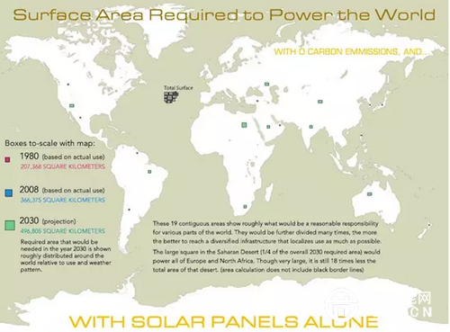 圖中所示的小方塊,就是每個國家滿足全國電力使用,所需要覆蓋的太陽能板面積。如果把全世界所有的能源加起來,面積僅有圖中所示的灰色區(qū)域那么大。