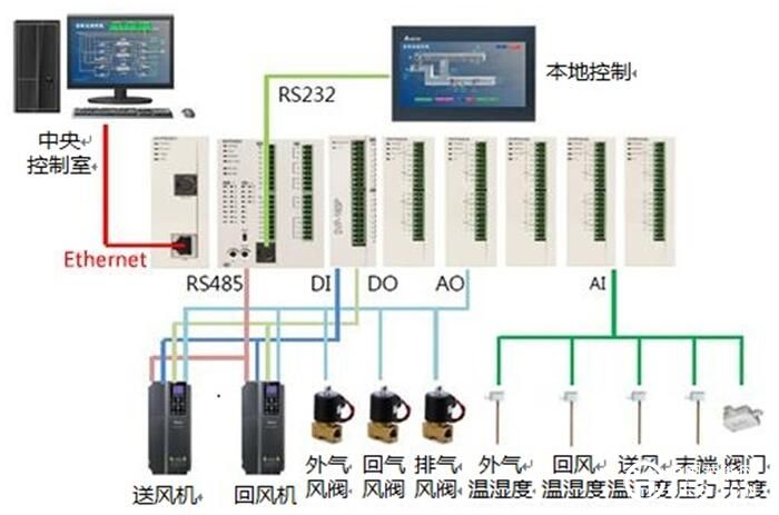 隨著經(jīng)濟(jì)發(fā)展,暖通空調(diào)系統(tǒng)的使用越來(lái)越密集,除了提供舒適的室內(nèi)環(huán)境,許多工廠(chǎng)也依賴(lài)空調(diào)系統(tǒng)對(duì)溫、濕度及粉塵的調(diào)節(jié)來(lái)提升制程質(zhì)量。然而根據(jù)統(tǒng)計(jì),在各類(lèi)型的建筑中,暖通空調(diào)系統(tǒng)都是最主要的耗能設(shè)備,因此如何在不影響室內(nèi)條件與設(shè)備運(yùn)行壽命的條件下,提高系統(tǒng)效率,將每一分能耗使用在需要的地方,成為用戶(hù)面臨的重要課題??諝馓幚頇C(jī)組為暖通空調(diào)系統(tǒng)的一部分,用于室內(nèi)空氣溫、濕度的調(diào)節(jié)和循環(huán)。傳統(tǒng)空氣處理機(jī)組無(wú)法實(shí)時(shí)掌握室內(nèi)、外空氣狀態(tài)并進(jìn)行互動(dòng)調(diào)節(jié),造成系統(tǒng)運(yùn)行效率低,耗電量大。為此,臺(tái)達(dá)在暖通空調(diào)系統(tǒng)的空氣處理機(jī)組中加裝了臺(tái)達(dá)節(jié)能自動(dòng)化系統(tǒng),系統(tǒng)應(yīng)用的產(chǎn)品包括臺(tái)達(dá)可編程邏輯控制器DVP-S系列、風(fēng)機(jī)水泵專(zhuān)用變頻器CP2000系列、高彩高解析人機(jī)界面DOP-B系列、智能傳感器及DIAViewSCADA工業(yè)監(jiān)控系統(tǒng)。系統(tǒng)架構(gòu)圖如下: