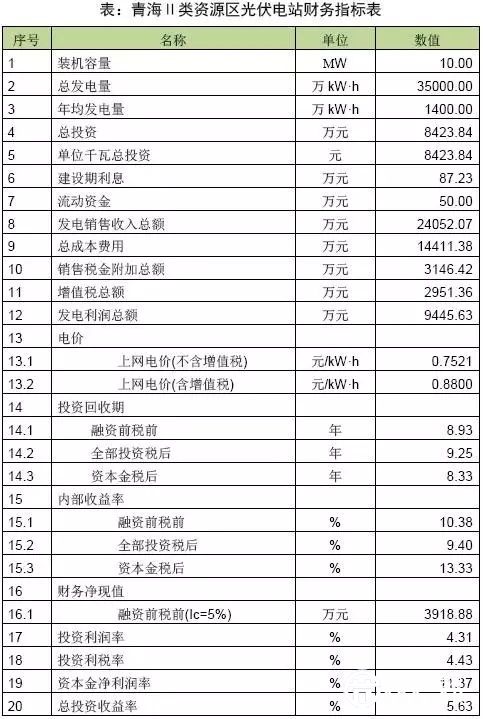 表2:青海省Ⅰ類資源區(qū)光伏電站項目財務(wù)指標(biāo)表