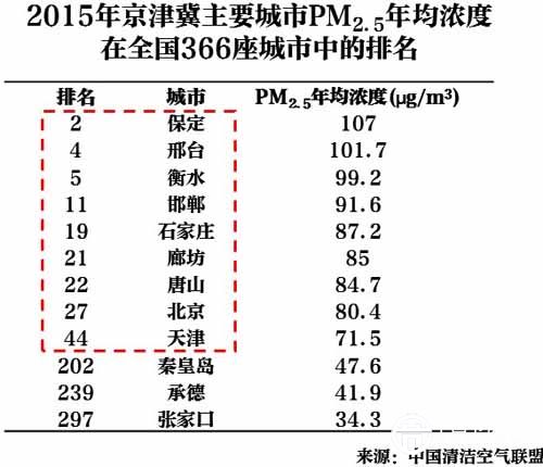 2015全年,北京、天津和河北省多個(gè)城市的PM2.5年均濃度排名全國靠前,并且都超出了35微克/立方米的國家標(biāo)準(zhǔn)。