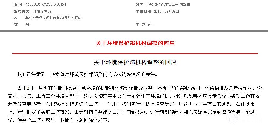據(jù)環(huán)保部介紹,去年2月,中央有關(guān)部門批復(fù)同意環(huán)保部機(jī)構(gòu)編制作部分調(diào)整,不再保留污染防治司、污染物排放總量控制司,設(shè)置水、大氣、土壤三個(gè)環(huán)境管理司。