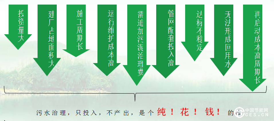 由于“只投入無產(chǎn)出”的特性導(dǎo)致傳統(tǒng)污水處理運(yùn)作模式無法產(chǎn)生任何經(jīng)濟(jì)效益,使得政府在污水處理事業(yè)上的投資較謹(jǐn)慎,同時(shí)社會(huì)融資壓力大,長(zhǎng)期資金短缺。