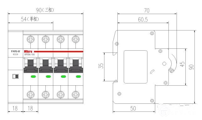 FAR6- W采用模塊化設(shè)計(jì),其結(jié)構(gòu)是驅(qū)動(dòng)模塊加微型斷路器。驅(qū)動(dòng)模塊僅18mm寬度,單相加N總寬度54mm,三相加N總寬度90mm。在業(yè)內(nèi)率先突破單極 18mm寬,最大額定工作電流100A。小巧的體積保證了FAR6-W可方便地安裝于現(xiàn)有的標(biāo)準(zhǔn)計(jì)量箱中。
