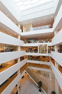 微軟的新辦公樓建于哥本哈根郊外的靈比,建筑占地面積為1.8萬平方米,由兩棟相鄰的立方體大樓組成,兩棟樓之間是一個(gè)巨大的V型中庭,形成一個(gè)明亮而寬敞的工作區(qū)域。作為補(bǔ)償,ABB的智能建筑系統(tǒng)可通過最佳溫度、空氣質(zhì)量和照明來保持完美的室內(nèi)環(huán)境。