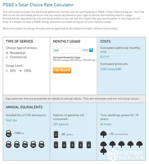 圖2:在PG&E的網(wǎng)站上輸入月均用電量,就可以確認“SolarChoice方案”的追加費用和環(huán)境貢獻數(shù)據(jù)(出處:PG&E)