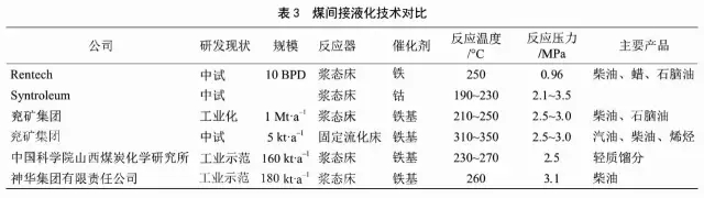 神華集團(tuán)有限責(zé)任公司的煤直接液化技術(shù)特點(diǎn)是采用可棄活性鐵催化劑用于煤分解,溶劑加氫后循環(huán),采用殼牌石油集團(tuán)有限公司氣化制氫。在實(shí)際生產(chǎn)中,2014年該煤直接液化項(xiàng)目綜合能量效率為58%,噸油煤耗為3.23tce(tce為噸標(biāo)準(zhǔn)煤),噸油水耗為5.82t。為擴(kuò)大煤種使用范圍,提高煤炭利用效率,神華集團(tuán)有限責(zé)任公司相繼推出了煤直接液化和間接液化聯(lián)產(chǎn)的工藝,煤間接液化生產(chǎn)的柴油屬超低硫、無氮化物、高十六烷值(>70)的潔凈柴油,與直接煤液化裝置生產(chǎn)的柴油(十六烷值,42)調(diào)和,提高直接液化的油品質(zhì)量,這樣可以有效地實(shí)現(xiàn)油品生產(chǎn)優(yōu)勢互補(bǔ),并配套建設(shè)了18萬噸級的煤間接液化示范的項(xiàng)目。其中神華集團(tuán)有限責(zé)任公司的煤間接液化項(xiàng)目采用自主研發(fā)的鐵基催化低溫漿態(tài)床技術(shù)(見表3)。