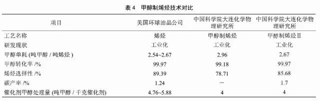 間接合成路線中,以甲醇為中間產(chǎn)物的烯烴/丙烯(MTO/MTP)技術(shù)與傳統(tǒng)的石腦油裂解相比,成本優(yōu)勢明顯。中美兩國都開發(fā)各自的甲醇制烯烴技術(shù),具體技術(shù)的對照見表4如美國環(huán)球油品公司(UOP)的烯烴工藝,中國科學(xué)院大連化學(xué)物理研究所的甲醇制烯烴(DMTO)工藝,中國清華大學(xué)的流化床甲醇制丙烯(FMTP)工藝,都已經(jīng)得到工業(yè)化驗(yàn)證。中國科學(xué)院大連化學(xué)物理研究所的甲醇制烯烴工藝與美國環(huán)球油品公司的烯烴技術(shù)在甲醇轉(zhuǎn)化率、烯烴甲醇單耗等指標(biāo)上相當(dāng),但在烯烴選擇性、碳產(chǎn)率,單位催化劑的處理量上稍低于美國環(huán)球油品公司的技術(shù)。