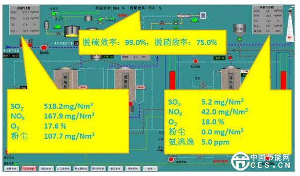 試運(yùn)行期間,該裝置保持了良好的性能指標(biāo),脫硫效率達(dá)到99%,脫硝效率達(dá)到75%,粉塵排放值達(dá)到10mg/Nm3以下,各項(xiàng)指標(biāo)基本達(dá)到“超低排放”標(biāo)準(zhǔn)。