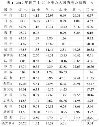世界各國(guó)火電結(jié)構(gòu)各不相同,電源結(jié)構(gòu)更是千差萬(wàn)別。20個(gè)電力大國(guó)的電力結(jié)構(gòu)(見(jiàn)表1)中,有的國(guó)家以煤電為主,如南非占93.77%,波蘭占84.33%,中國(guó)占70.45%,澳大利亞占69.70%,印度占67.94%。有的國(guó)家氣電比重比較大,氣電占總發(fā)電量50%以上的國(guó)家只有墨西哥(占52.22%);氣電占40%以上的國(guó)家有3個(gè),日本占41.2%,俄羅斯占49.31%,還有意大利占46.15%。有的國(guó)家以水電為主,如挪威占96.63%,加拿大占58.86%,巴西占80.60%。核電為主的國(guó)家只有法國(guó),占76.65%。