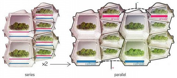 將苔蘚電池設計成具有伸縮性的系統(tǒng),可應用于城市地區(qū)是Mitrofanova的目標之一。苔蘚光伏電池的組織形式有并聯(lián)和串聯(lián)電路兩種,可安裝在建筑物的外墻。