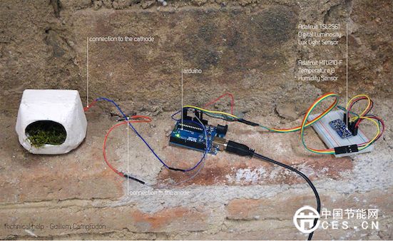 除此之外,一個苔蘚發(fā)電單位面積為100×100毫米,一單位的發(fā)電量為0.35伏特?;旌咸坷w維和水凝膠的陽極(切得既小又薄)在的立方體中,有一層碳織物以及被苔蘚掩蓋的混合物。該發(fā)電系統(tǒng)還配有一個監(jiān)測裝置,內(nèi)設傳感器,每5秒自動檢測內(nèi)部環(huán)境的勒克斯(光照單位)、濕度、溫度和電壓等指數(shù),并即時保存數(shù)據(jù)。