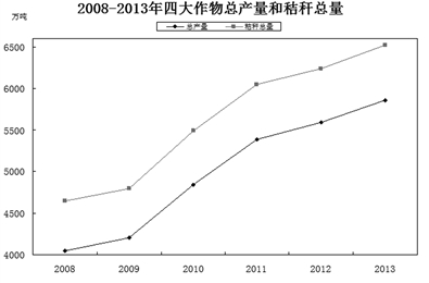 如圖所示,近些年來,黑龍江省玉米、水稻、大豆、小麥四大作物秸稈總量隨農(nóng)作物總產(chǎn)量逐年增長