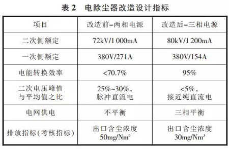 對窯尾電除塵器兩相高壓電源系統(tǒng)改造升級為三相電源系統(tǒng),主要包括電除塵器三相高壓電控系統(tǒng)、電控柜和三相整流變壓器等供電系統(tǒng),見表2。電除塵器改造主要內(nèi)容是對8臺電除塵器高壓控制柜進(jìn)線供電電源進(jìn)行改造,由兩相電源改為三相電源,各增加一根電纜;對原有8臺電除塵器高壓控制全部進(jìn)行更換,每個電場增加兩根信號監(jiān)測電纜(控制柜至整流變壓器);對原有8臺整流變壓器進(jìn)行更換(底座及連接法蘭調(diào)整)。