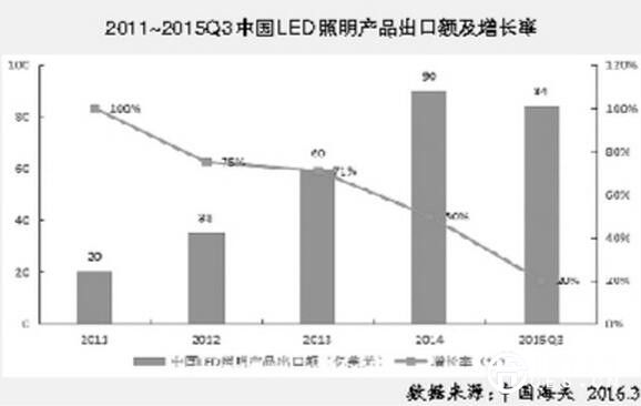 LED照明產(chǎn)品作為照明產(chǎn)業(yè)中快速興起的一類產(chǎn)品,2011年到2014年產(chǎn)品出口量迅速增加。在全球禁止白熾燈計(jì)劃的推動下,中國LED照明出口量保持較高水平,2014年出口總額為90億美元,同比增長50%,連續(xù)4年增長速度均處于60%以上。2015年以來,隨著LED照明滲透率的逐步提升,市場需求放緩,中國LED照明產(chǎn)品的出口額也在放緩。2015年前三季度出口總額為84億美元,同比2014年增長20%,增長速度大幅下降。