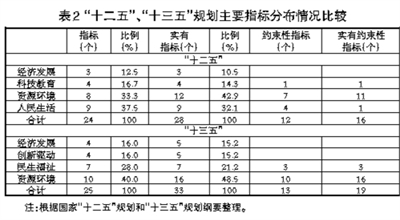 第一,“十三五”規(guī)劃增加了綠色發(fā)展指標。從歷次五年規(guī)劃的綠色發(fā)展指標看,“十一五”規(guī)劃有7個(實有8個);“十二五”規(guī)劃有8個(實有12個); “十三五”規(guī)劃進一步提高至10個(實有指標33個)。從歷次五年規(guī)劃的綠色發(fā)展指標占實有指標總數(shù)的比重來看,“十一五”規(guī)劃的比例為34.8%,“十二五”規(guī)劃提高至42.9%,“十三五”規(guī)劃又進一步提高至48.5%。從實有約束性指標來看,“十一五”規(guī)劃只有6項指標,“十二五”規(guī)劃有11項, “十三五”規(guī)劃16項實有指標全部為約束性指標(見表2)。這就會極大地強化各級政府履行環(huán)境保護職責的約束機制,保障如期完成綠色發(fā)展指標,甚至可以超額完成綠色發(fā)展指標。