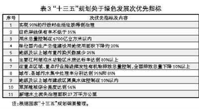 第二,“十三五”規(guī)劃專門列出了綠色發(fā)展次優(yōu)先指標,共計11個(見表3),同樣具有約束性。形象地講,中國的五年規(guī)劃是越來越綠色的規(guī)劃,這會起到促進綠色發(fā)展“指揮棒”的引導(dǎo)作用。