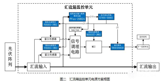 如圖二所示,在光伏匯流箱系統(tǒng)中,PVxx-29B24系列具備的200-1500VDC電壓輸入、4000VAC隔離耐壓、高可靠特性,可從高壓端直接取電,經(jīng)轉(zhuǎn)換輸出24VDC電壓給監(jiān)控電路供電。采用F0505S-1WR2給霍爾傳感器隔離供電,充分確保高低壓之間安全隔離,;采用B0503XT-2WR2模塊進(jìn)行隔離轉(zhuǎn)換輸出3.3V給MCU供電;通信采用集成隔離電源的TD501D485H通信模塊,可抑制電磁干擾和消除接地環(huán)路影響。整體電源方案在滿足功能需求及安全隔離,同時(shí)又便于整體系統(tǒng)簡(jiǎn)化設(shè)計(jì)和穩(wěn)定可靠。