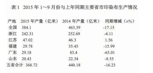 據(jù)國家統(tǒng)計局統(tǒng)計數(shù)據(jù)顯示,我國印染布產(chǎn)量從2005年的362.16億米增長至2014年的536.74億米。2014年,我國印染布行業(yè)產(chǎn)量比2013年(542.36)同比下降1.04%。由于環(huán)保政策的壓力,加之環(huán)保壁壘導(dǎo)致印染行業(yè)進入門檻提高,據(jù)估算,2015年的印染布行業(yè)產(chǎn)量或較2014年大幅下降。據(jù)中國印染行業(yè)協(xié)會對2015年1-9月份印染行業(yè)經(jīng)濟運行分析,2015年1~9月份,規(guī)模以上印染企業(yè)印染布產(chǎn)量384.1億米,較2014年同期下降17.15%。浙江、江蘇、福建、廣東和山東等東部沿海五省產(chǎn)量368.72億米,占全國總產(chǎn)量的96%,除江蘇外,浙江、福建、廣東、山東印染布產(chǎn)量較2014年同期都有不同程度減少,其中廣東省減少65.01%。