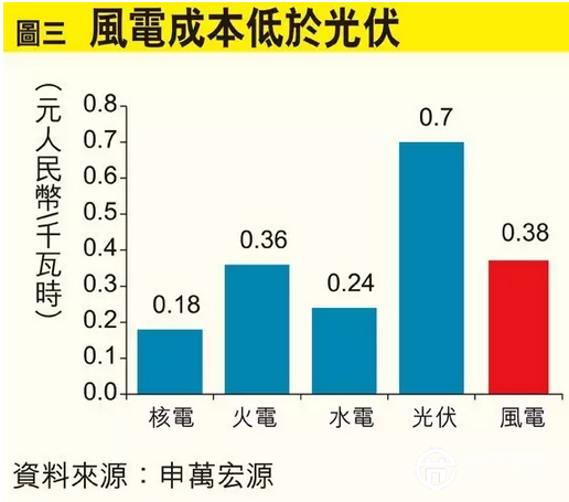 看官又可能會問,為何是風(fēng)電、不是光伏呢?其實(shí)看看每度電的成本就清楚了。根據(jù)申萬宏源報告顯示,相對光伏每度電成本為0.7元人民幣/千瓦時,風(fēng)電只需0.38元人民幣/千瓦時(見圖三)。