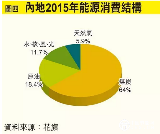 政策方面,內(nèi)地污染問題嚴(yán)重,必須全方位出擊,方能改善空氣質(zhì)素。目前內(nèi)地的能源消費(fèi)結(jié)構(gòu),仍是以燃煤為主,盡管近年比重已見降低,惟2015年煤炭占比仍逾6成(見圖四),同時,燃煤更是引起霧霾的主要成因之一,故此,提升清潔能源比重可謂刻不容緩。