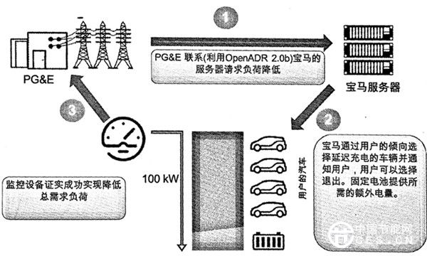 美國太平洋天然氣電力公司(PG&E)與寶馬公司選取了100輛的寶馬i3進行了為期18個月的“需求響應”實驗項目。所謂“需求響應”,主要的思路是“移峰填谷”,鼓勵用戶在用電谷時進行充電。具體的實驗內(nèi)容是,當PG&E面臨較大用電壓力、有降低負荷需求時,會向?qū)汃R公司發(fā)出通知,然后寶馬公司會向這100輛選中的寶馬i3用戶發(fā)出停止充電請求,用戶可根據(jù)意愿選擇接受或拒絕。對于選擇接受的用戶,寶馬公司會通過遠程終止其充電進程,并給予相應的獎勵。此外,該項目還利用寶馬電動汽車拆卸下來的電池,作為靜態(tài)儲能裝置,在非峰荷時段吸收、貯存可再生電力,并在需求增長的時段向電網(wǎng)提供這部分被事先貯存的電力。