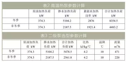 采用8500kW蓄能式高溫水源熱泵機組。由于峰谷電價相差較大,熱泵系統(tǒng)在電價平、谷電價期,熱泵機組滿負(fù)荷運轉(zhuǎn),將產(chǎn)生的多余熱量儲存于蓄能水罐中,在電價尖峰電價期,停運熱泵機組,采用蓄能水罐中的熱水用于摻水及原油加熱。