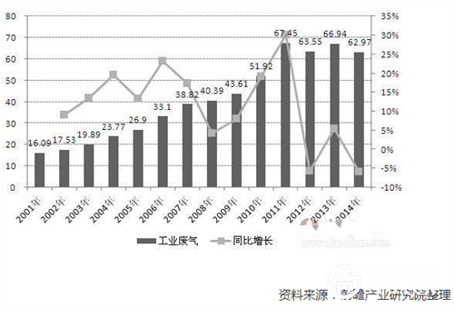 國內經濟騰飛的背后,是日益嚴重的環(huán)境污染。數(shù)據顯示,2001年,全國工業(yè)廢氣排放量僅為16.09萬億立方米,隨后十年逐年增長,到2011年時達到頂峰,全國工業(yè)廢氣排放量高達67.45萬億立方米。此后國家開始重視大氣污染治理,到2014年時,工業(yè)廢氣排放量下降至62.97萬億立方米。