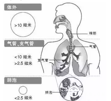 PM2.5是可以到達肺泡的。PM2.5以下的細顆粒物,上呼吸道擋不住,它們可以順利下行,進入細支氣管、肺泡。我們的呼吸系統(tǒng)像植物的根系,自上而下,氣管分出支氣管,支氣管分出密密麻麻的細支氣管,密密麻麻的細支氣管又連著密密麻麻的肺泡,肺泡的數(shù)量有三四億個。吸進去的氧氣最終進入肺泡,再通過肺泡的壁進入毛細血管,再進入整個血液循環(huán)系統(tǒng)。我們吸進去的PM2.5,因為太小,也能進入肺泡,再通過肺泡的壁進入毛細血管,進而進入整個血液循環(huán)系統(tǒng)。
