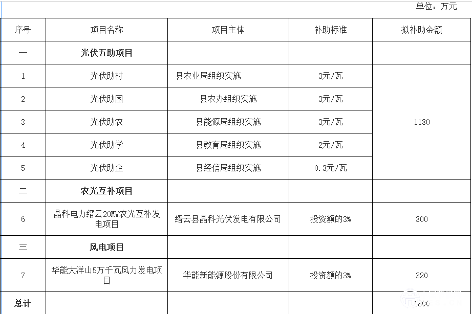 (一)加大資金扶持力度。各部門要積極爭取本系統(tǒng)上級資金,支持光伏發(fā)電項目發(fā)展。已爭取到的清潔能源示范縣補助資金,主要用于支持光伏發(fā)電項目發(fā)展。“光伏助村”、“光伏助困”、“光伏助農”項目按照裝機規(guī)模3元/瓦補助;具體補助項目視資金統(tǒng)籌情況安排年度計劃。