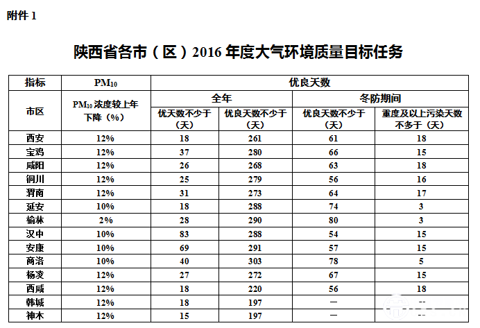1.陜西省各市(區(qū))2016年度大氣環(huán)境質量目標任務