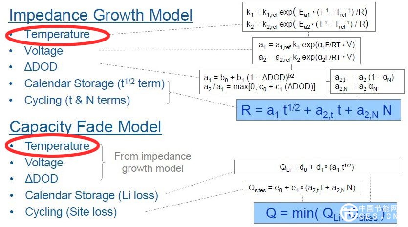 下圖是電池內(nèi)阻增加的模型和容量衰減模型,可以看到里面電池運(yùn)行時(shí)溫度永遠(yuǎn)占據(jù)一個(gè)很重要的角色。如果電池溫度不受控,容量就得按照指數(shù)的形式衰減。