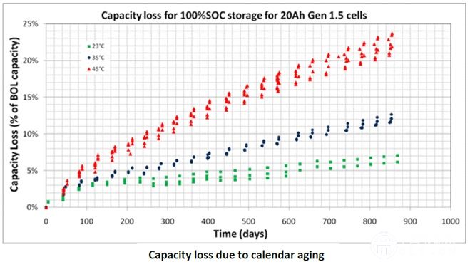 另一個(gè)角度,如果我們從一款電池在不同溫度下的循環(huán)壽命和日歷壽命來(lái)看,更容易發(fā)現(xiàn)溫度對(duì)電池使用時(shí)間和充放次數(shù)的實(shí)際影響,下面圖片就直觀反映了這一變化。消費(fèi)者對(duì)于手機(jī)電池的信心,也影響到了整個(gè)電動(dòng)汽車電池的信心,而要大家接受電池能使用很長(zhǎng)一段時(shí)間(5年~10年),溫度是一個(gè)必須要控制的一個(gè)值。