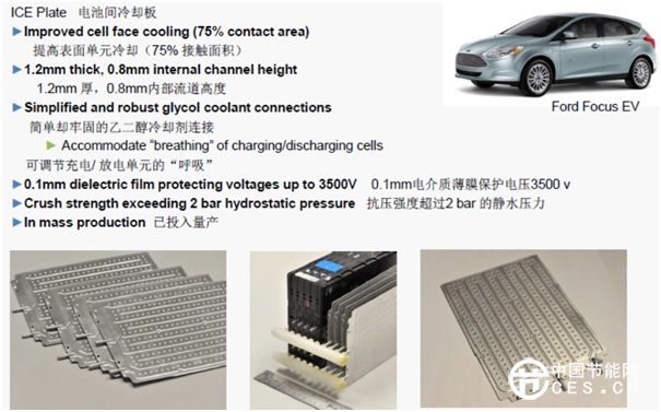 福克斯EV其實(shí)是用了PHEV的功率型電池來(lái)做能量型電池,它的液冷和加熱系統(tǒng)的性能是比較好的,事實(shí)上這款車即使在密西根的冬季也能扛過(guò)去。通過(guò)整個(gè)系統(tǒng)的設(shè)計(jì),綜合使用車聯(lián)網(wǎng)、充電系統(tǒng)和整車控制器,可以讓車子在出發(fā)前充電時(shí)調(diào)節(jié)電池包溫度。每個(gè)電池用這么些冷卻板,如圖11所示,其實(shí)也花了老大的血本??傮w而言,這也表達(dá)了工程師對(duì)電池長(zhǎng)期使用的憂慮而采取的一種辦法。