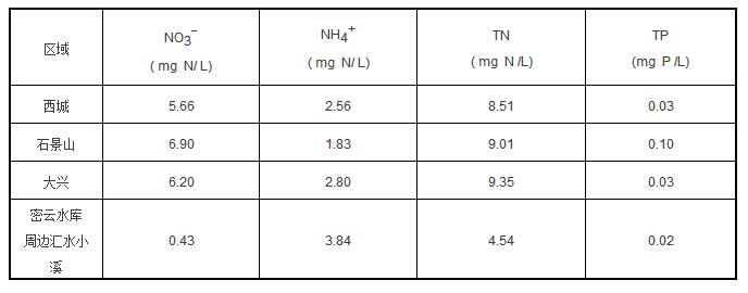 北京自來水在靜止條件下便可致藻類生長,一方面說明北京自來水中N、P含量仍然高于藻類繁殖標(biāo)準(zhǔn),另一方面證明“一潭死水”無助于水的自然凈化。關(guān)于導(dǎo)致水體富營養(yǎng)化的N、P閾值,國際標(biāo)準(zhǔn)如上所述分別為TN=0.5~1.2 mg N/L和TP=0.03~0.1 mg P/L。按《生活飲用水衛(wèi)生標(biāo)準(zhǔn)》(GB5749—2006),僅NO3-<10 mg N/L便超過富營養(yǎng)化國際閾值標(biāo)準(zhǔn)的高值(1.2 mg N/L);飲用水國標(biāo)中目前因種種原因還未涉及P的標(biāo)準(zhǔn),這就為藻類生長埋下了伏筆。北京部分區(qū)域自來水水質(zhì)經(jīng)實際檢測(24 h平均樣)如表1所示。顯然,這樣的水質(zhì)確實已超過富營養(yǎng)化閾值國際標(biāo)準(zhǔn)。相反,向密云水庫匯水的小溪中的N、P卻低于自來水中的含量。