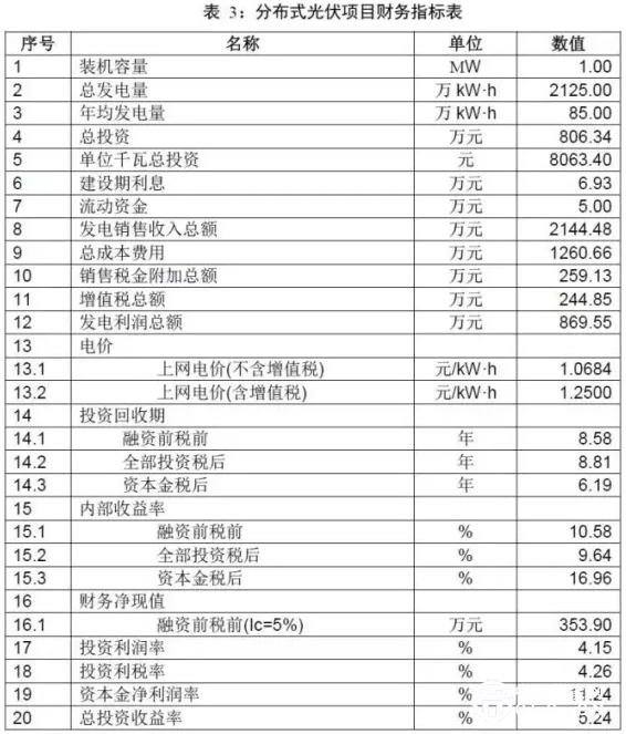 分布式光伏項(xiàng)目可選擇三種模式(國家補(bǔ)貼為20年):如果選擇“全額上網(wǎng)”方式,對(duì)應(yīng)的光伏標(biāo)桿電價(jià)為0.95元/kWh;如果選擇“自發(fā)自用,余電上網(wǎng)”,國家給予0.42元/kWh的電價(jià)補(bǔ)貼,上網(wǎng)部分按照當(dāng)?shù)厝济簶?biāo)桿電價(jià)收購;全部“自發(fā)自用”,則電價(jià)為售電價(jià)格、國家電價(jià)補(bǔ)貼價(jià)格與省級(jí)補(bǔ)貼之和。根據(jù)河南省電網(wǎng)銷售電價(jià)表,項(xiàng)目電價(jià)采用一般工商業(yè)電價(jià):1.25元/kWh,項(xiàng)目裝機(jī)容量為1MW,單位造價(jià)為8000元。依據(jù)以上條件測(cè)算,項(xiàng)目融資前稅前收益率在10.58%之間,滿足投資要求。