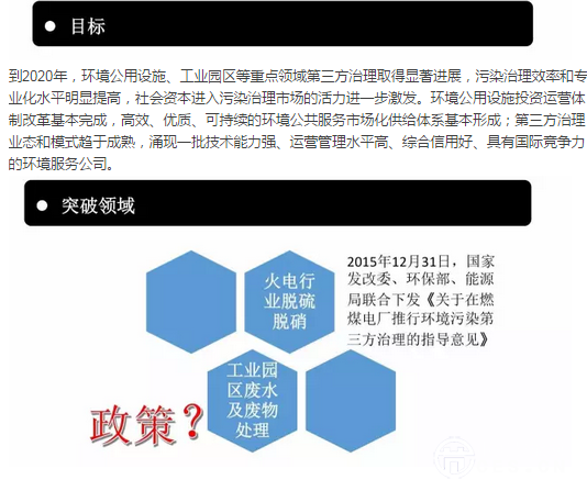 中央明確提出“建立吸引社會(huì)資本投入生態(tài)環(huán)境保護(hù)的市場(chǎng)化機(jī)制,推行環(huán)境污染第三方治理”。這既是環(huán)境管理制度的重大創(chuàng)新,也是發(fā)展環(huán)保市場(chǎng)的重大舉措,更是當(dāng)前推進(jìn)治污模式轉(zhuǎn)變的重要切入點(diǎn)。