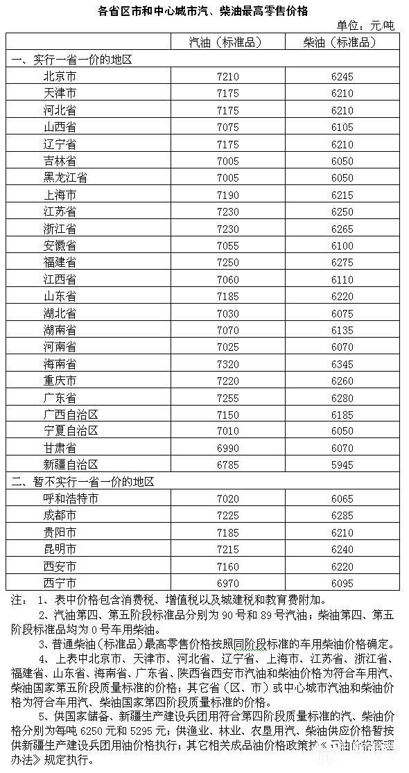附:各省區(qū)市和中心城市汽、柴油最高零售價(jià)格表