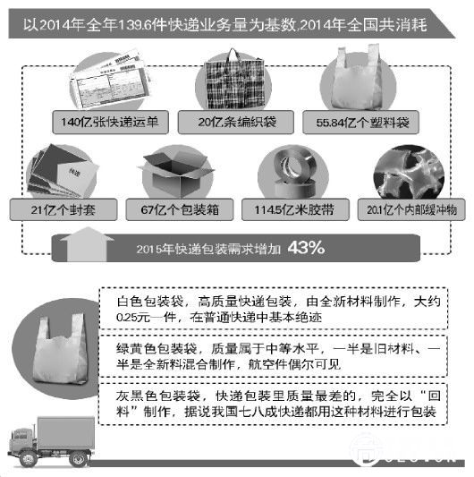 以2014年全年139.6件快遞業(yè)務(wù)量為基數(shù),2014年全國(guó)共消耗140億張快遞運(yùn)單、20億條編織袋、55.84億個(gè)塑料袋、21億個(gè)封套、67億個(gè)包裝箱、114.5億米膠帶、20.1億個(gè)內(nèi)部緩沖物;2015年快遞包裝需求增加了43%。
