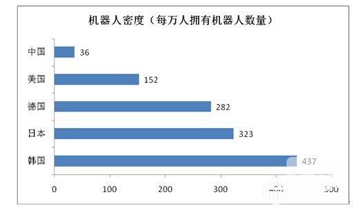 2014年,前五大機器人消費國的機器人密度(每萬人擁有機器人數(shù)量)為:韓國437臺、日本323臺、德國282臺、美國152臺、中國36臺,差距顯而易見。即使與國際平均水平55臺相比,中國也有較大的提升空間。這也充分說明中國未來機器人空間巨大。即使不考慮其它國家的發(fā)展,中國與這些國家如此巨大的差距,僅僅靜態(tài)比較都存在幾倍的空間。