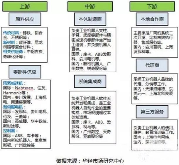 工業(yè)機(jī)器人行業(yè)上游是核心零部件,主要的是減速機(jī)和控制系統(tǒng),這相當(dāng)于機(jī)器人的“大腦”,中游是機(jī)器人本體,就是機(jī)器人的“身體”,下游是系統(tǒng)集成商,國內(nèi)企業(yè)都集中在這個環(huán)節(jié)上。