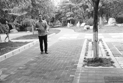 圖為工作人員正在介紹鋪設(shè)了透水磚的千佛山南路11號院。
