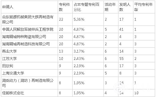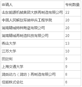 從我國再制造產(chǎn)業(yè)專利技術(shù)申請人構(gòu)成來看,山東能源機(jī)械集團(tuán)大族再制造有限公司申請的專利最多,達(dá)到22個;中國人民解放軍裝甲兵工程學(xué)院、湖南精城特種陶瓷有限公司和湖南精城再制造科技有限公司均位列第二,專利數(shù)均為20個。