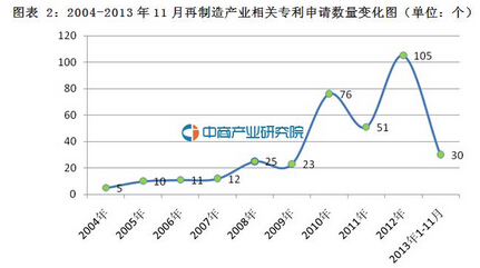 2004-2012年,我國再制造產(chǎn)業(yè)的專利申請數(shù)量大體上呈逐年上升趨勢。2004年,我國再制造產(chǎn)業(yè)專利申請數(shù)量僅為6個;2011年,專利申請數(shù)上升為51個,到2012年增加至105個,2013年1-11月,我國再制造產(chǎn)業(yè)專利申請數(shù)量為30個。