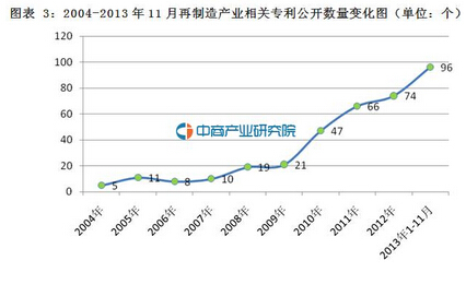 2004-2012年,我國再制造產(chǎn)業(yè)的專利公開數(shù)量呈逐年上升趨勢。2004年,我國再制造產(chǎn)業(yè)專利公開數(shù)量為5個;2011年,專利公開數(shù)上升為66個,到2012年增加至74個,2013年1-11月,我國再制造產(chǎn)業(yè)專利公開數(shù)量為96個。